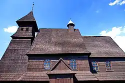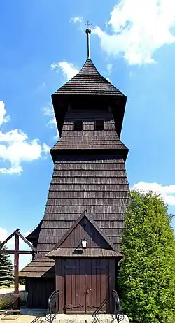 Prezbiterium oraz nawa główna pokryte są stromym dwuspadowym dachem obitym gontem. Dach nad nawą główną jest nieco wyższy i posiada w kalenicy niewielką sygnaturkę nakrytą stożkowym dachem. Kościół posiada czołową wieżę dzwonną o konstrukcji słupowej z mocno skośnymi ścianami i szerokim dachem namiotowym. Od zewnątrz wieżę pokrywa gont.