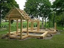 Na odkrytych fundamentach zrekonstruowano rzut przyziemia kościoła w postaci ułożenia dolnych belek podwalinowych w wieży, nawie głównej i prezbiterium. Belki drewniane 30/40 cm wykonane są z wiślańskiego świerku i posiadają wymiary belek pierwotnego kościoła.