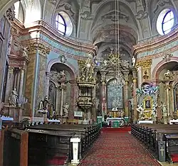 W środku szczególnie cenne są freski iluzjonistyczne na sklepieniu prezbiterium oraz w kopule – dzieło pochodzącego z Włoch Galii da Bibieny. Główny ołtarz wykonał A. G. Bussi, a jego centralną częścią jest obraz autorstwa Franza Xavera Palka z 1745 r. Po bokach ołtarza znajdują się rzeźby św. Agnieszki i św. Katarzyny, których autorem miałby być bawarski rzeźbiarz Johann Baptist Straub.