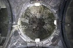 Na dachu świątyni znajduje się duży, dwunastokątny bęben, z parami wąskich, ozdobnych kolumienek na krawędzi każdego boku[3]. Na bębnie spoczywa stożkowa kopuła typu parasolowego[2]. W każdej ze ścian budowli znajduje się po jednym wąskim oknie, ponadto u podstawy bębna zlokalizowane są kolejne cztery okienka[4]. Do wnętrza prowadzą dwa wejścia: jedno na ścianie południowej i drugie na północnej[5], przy czym południowy portal obramowany jest podwójnym łukiem[4].