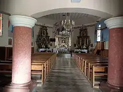 Jest to budowla murowana, wybudowana z cegły o wątkach gotyckim i wendyjskim z dodatkiem kamieni polnych, kół młyńskich i kul kamiennych. Świątynia jest otynkowana, salowa, zamknięta trójbocznie i nie posiadająca wydzielonego prezbiterium. Wyposażenie reprezentuje style: barokowy i manierystyczny[2].