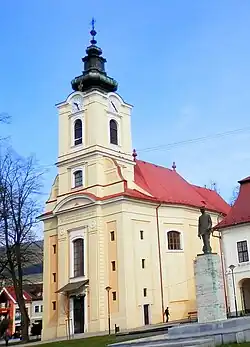 Kościół wzniesiono po wielkim pożarze miasta z 1779 r., w latach 1782–1793. Murowany, jednonawowy, z masywną, czworoboczną wieżą na osi. Utrzymany w stylu barokowym, z późnobarokowym wystrojem i wyposażeniem wnętrza. W głównym ołtarzu obraz Wniebowzięcia Najświętszej Marii Panny autorstwa Jána Juraja Fuchsa i tabernakulum dłuta Andreja Marušiaka z Rajca. Polichromię wnętrz kościoła wykonał bańskobystrzycki malarz Václav Zettler w 1786 r., natomiast organy są dziełem znanego mistrza Jána Pažického z Rajca.