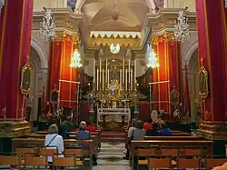 Wewnątrz znajduje się ołtarz główny oraz dziewięć ołtarzy bocznych[6].