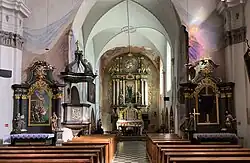 Ołtarze boczne są późnobarokowe z XVIII wieku. W lewym znajduje się płaskorzeźba przedstawiająca Nawiedzenie św. Elżbiety oraz rzeźby św. Anny i Joachima, w prawym ołtarzu także płaskorzeźba – Chrystusa ukrzyżowanego oraz rzeźby św. Heleny i Konstantyna Wielkiego. W kaplicy południowej ołtarz regencyjny z akantową dekoracją snycerską oraz rzeźbami św. Karola Boromeusza (z lewej) i św. Franciszka (z prawej). W środku ołtarza obraz apoteozy św. Anny oraz nad nim owalny obraz św. Apolonii Aleksandryjskiej. W kaplicy polichromie ze scenami z życia św. Anny. W kaplicy północnej ołtarz późnobarokowy z obrazem Matki Boskiej Częstochowskiej z poł. XX w. W kaplicy polichromie z XVIII w. z żywotem św. Jana Nepomucena oraz zabytkowe rzeźby barokowo-ludowe z XVIII wieku (Chrystusa Frasobliwego oraz Matki Boskiej Bolesnej).