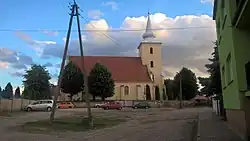 Późnogotycki, zbarokizowany kościół, murowany z cegły, od wysokości dwóch metrów również otynkowany i wymalowany. Świątynia jest trzynawowa, halowa, pięcioprzęsłowa, z niewyodrębnionym prezbiterium[2][7].
