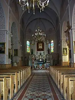 Kościół jest trójnawowy. Na frontonie znajduje się nisza a w niej figura Matki Boskiej Niepokalanej.