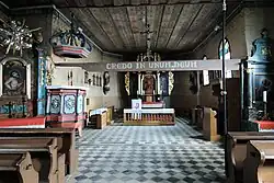 Wnętrze głównie barokowe. Ołtarz główny z około 1700 roku z obrazem Zesłania Ducha Świętego. Ołtarz boczny lewy z XVIII wieku z barokowym obrazem Chrystusa Miłosiernego (z przełomu XVII wiek i XVIII wieku). Ołtarz boczny prawy z początku XVIII wieku z obrazem św. Józefa z Dzieciątkiem. Ambona barokowa, z XVII wieku, z baldachimem z XVIII wieku. Późnogotycka dębowa kropielnica z XVI wieku, wymieniona w protokole wizytacyjnym z 1679 roku. Późnogotyckie są również portale z początku XVI wieku. Wewnątrz kościoła współczesna polichromia patronowa na stropie z 1965.