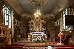 Budowla jest drewniana, jednonawowa, posiada konstrukcję zrębową. Świątynia jest orientowana. Jej prezbiterium jest mniejsze w stosunku do nawy, zamknięte jest trójbocznie, z boku jest umieszczona zakrystia. Od frontu i z boku nawy znajdują się dwie kruchty. Kościół nakrywa dach dwukalenicowy, pokryty gontem, na dachu jest umieszczona kwadratowa wieżyczka na sygnaturkę. Zwieńcza ją cebulasty blaszany dach hełmowy z latarnią. Wnętrze jest nakryte płaskimi stropami (w prezbiterium z fasetą), ozdobionymi ornamentem roślinnym i geometrycznym. Małe organy znajdują się na chórze muzycznym, podpartym dwoma słupami. Ołtarz główny w stylu neogotyckim jest ozdobiony barokowymi rzeźbami. Ołtarze boczne w stylu barokowym pochodzą z 2 połowy XVIII wieku. Dwa portrety trumienne zostały namalowane na blasze[2].