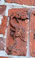 | Składająca się z pięciu płytek kompozycja przedstawiająca dwa splątane ze sobą szyjami dwunożne, skrzydlate smoki. Być może jest to ilustracja dwoistej (zawierającej pierwiastki dobra i zła), skomplikowanej natury człowieka. Według J. Kochanowskiej płytki pochodzą z początku XX w. i są kopią średniowiecznych oryginałów. | |