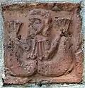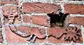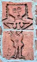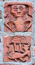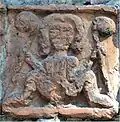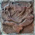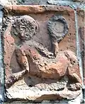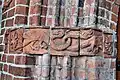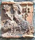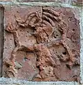 Relief przedstawia człowieka siedzącego na świni i trzymającego w jednym ręku lilię, a w drugim - kwiat (najprawdopodobniej różę). Świnia to symbol nieczystości lub diabła, lilia i róża to symbole, czystości i doskonałości. |