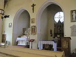 Mieści się przy wschodniej ścianie świątyni, tak samo jak prezbiterium ewangelickie. Posiada drewniany, lekko pozłacany ołtarz z kopią obrazu Madonny Sykstyńskiej i tabernakulum. Po prawej stronie tabernakulum znajduje się miejsce celebransa, współcelebransów liturgii i lektorów. Po obu stronach tabernakulum znajdują się dwie rzeźby: po lewej św. Franciszka z Asyżu z Dzieciątkiem Jezus, a po prawej Jezusa Miłosiernego. Przy obrazie mieściły się złocone świeczniki, skradzione w 2013 roku[4], a przy głównym, drewnianym ołtarzu także srebrzony krzyż papieski, który po zamknięciu kościoła został przeniesiony do kaplicy parafialnej. Całe prezbiterium wymalowano w kolorach białym i jasnożółtym, zaś ołtarz z obrazem Madonny – w kolorach brązowym i złotym.