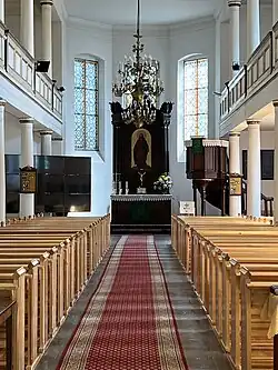 W 1881 doszło do przebudowy świątyni na styl neoklasycystyczny[2]. Dokonano powiększenia okien i dobudowano zakrystię oraz apsydę. We wnętrzu umieszczono nową ambonę i ołtarz z obrazem przedstawiającym Jezusa Chrystusa, autorstwa Karla Gottfrieda Pfannschmidta z Berlina[3].