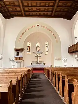 Dominantą wnętrza jest marmurowy ołtarz z sześcioma świecami i dużym dębowym krzyżem. W apsydzie znajdują się cztery malowane okna. Kazalnica zbudowana jest z drzewa dębowego, a marmurowa chrzcielnica komponuje z ołtarzem. Strop składa się z drewnianych kasetonów, co pozytywnie wpływa na akustykę kościoła.