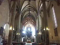 Czteroprzęsłowe prezbiterium długości 15 m, zamknięte trójbocznie, oświetlone jest czterema wysokimi oknami i nakryte pięknym sklepieniem sieciowym. Nawy (również czteroprzęsłowe) przykryte są sklepieniem gwiaździstym, wspartym na sześciu ośmiobocznych filarach o kwadratowych bazach. Do głównej nawy, długości 27 m, światło przenika jedynie dwoma gotyckimi oknami w jej południowej ścianie. Od zachodu nawę kończy niewysoki chór o trzech przęsłach, wsparty na dwóch przysadzistych filarach. Okazałe organy pochodzą z warsztatu mistrza J. Tučeka z Kutnej Hory w Czechach. Od północnej strony do naw dobudowana jest kaplica szerokości dwóch przęseł, sklepiona sieciowo i nakryta osobnym dachem. Pod jej posadzką znajdują się groby miejscowych ziemian z rodziny Okolicsanyich.