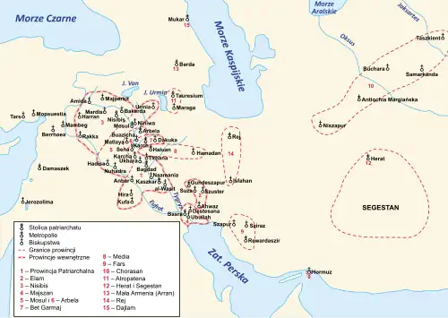 - ↑ Fiey, POCN, 47 (Armenia), 72 (Damaszek), 74 (Dailam i Gilan), 94–6 (Indie), 105 (Chiny), 124 (Rai), 128–9 (Sarbaz), 128 (Samarkanda i Beth Turkaye) i 139 (Tibet)