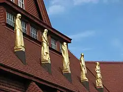 Na krawędziach dachu kościoła od strony północnej, zachodniej i południowej ustawiono 12 pozłacanych figur z brązu, wysokich na 2 m i ważących po 250 kg, wykonanych przez Christiana Erikssona. Pierwotnie miały to być figury 12 apostołów, ale później artysta zmienił zamiar i postanowił w figurach zawrzeć różne stany psychiczne człowieka, dając – dla ułatwienia – stosowne napisy na cokołach figur. Od strony północnej są to kolejno, patrząc od wschodu: Rozpacz, Nieśmiałość, Megalomania, Pobożność, Ufność, po stronie zachodniej Natchnienie i Zachwyt a po południowej: Pokora, Miłość, Smutek, Melancholia i Skupienie.