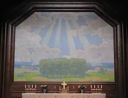 Posadzka świątyni jest wykonana z drewna. Wnętrze urządzono w stylu tzw. narodowego romantyzmu, podczas gdy w kompozycji ołtarza widoczne są wpływy secesji. Prezbiterium wznosi się kilka stopni wyżej, niż reszta kościoła. W ołtarzu umieszczone jest obraz pędzla księcia Eugeniusza z 1912. Malowidło nazywa się "Den Heliga Lunden" ("Zielony zagajnik") i przedstawia spokojny krajobraz rozświetlony promieniami słońca przedzierającymi się przez chmury. Inspirację twórca zaczerpnął z pejzaży Toskanii. Dzieło wzbudza skupienie, chociaż nie ma religijnych odniesień. Przed ołtarzem stoi rzeźba dłuta Erikssona przedstawiająca czterech Lapończyków stojących wokół pozłacanego krzyża.