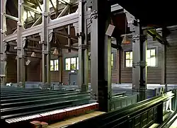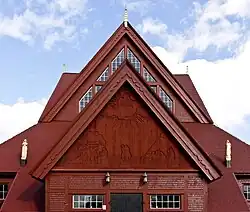 W czterech szczytach dachów umieszczono ogromne, trójkątne okna. Ich przeszklone powierzchnie sprawiają, że do wnętrza przedostaje się dużo światła. W konstrukcji fantazyjnie uformowanych belek stropowych a nawet w sposobie, w jaki wpadające do środka promienie oświetlają mroczne ściany budowli widoczny jest wpływ architektury i sztuki dekoracyjnej lapońskich namiotów.