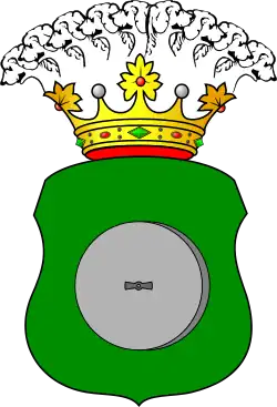 W polu zielonym – kamień młyński barwy naturalnej. Nad tarczą w koronie szlacheckiej – dziewięć głów szczenięcych[1].