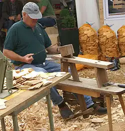 Drewniana ławka posiada zamocowany krótki, wąski, drewniany blat, na którym układany jest obrabiany kawałek drewna. Poddawany obróbce element przytrzymywany jest i dociskany do blatu przez drewniany klocek, tzw. głowę, zamocowany na trzonku, przechodzącym przez otwór w blacie i ławce, zakończonym u dołu drewnianym pedałem/dźwignią. Operator podczas pracy siedzi okrakiem na ławce, stopą wywiera regulowany nacisk na pedał, co powoduje odpowiedni docisk umieszczonego na wierzchu klocka do blatu, powodując w ten sposób stabilne mocowanie obrabianego elementu[1][2].