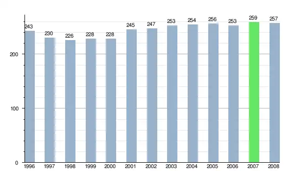 Według danych z dnia 31 grudnia 2012, wieś zamieszkiwało 257 osób, w tym 134 kobiety i 123 mężczyzn[7].