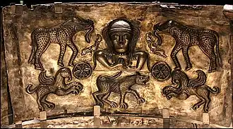 Na elemencie B widnieje popiersie bogini, po jej obu stronach znajdują się koła o sześciu szprychach i mityczne zwierzęta: dwa stworzenia podobne do słoni i dwa gryfy. Pod jej postacią znajduje się duży pies lub wilk[4].