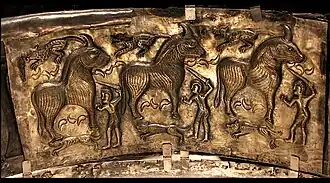 - Na elemencie a brodata postać (bóstwo) trzyma każdą ręką za ramię mniejszą postać mężczyzny. Obie postacie mężczyzn sięgają w górę w stronę małego dzika. Pod stopami mężczyzn (na ramionach boga) po lewej stronie znajduje się pies, a po prawej – skrzydlaty koń.