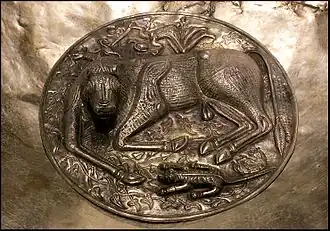 - Bogini na elemencie g ma skrzyżowane ramiona. Nad jej prawym barkiem widnieje scena z mężczyzną walczącym z lwem. Jest to Herkules w scenie walki z lwem nemejskim[3]. Na jej lewym ramieniu znajduje się skacząca postać podobna do przedstawionej na elemencie c.