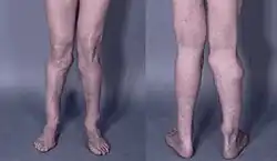 - Zmiany dotyczące układu kostnego: szybszy rozrost kłykci wewnętrznych kości udowej niż zewnętrznych, co powoduje pochylenie do wewnątrz powierzchni stawów kolanowych.