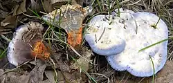 Miąższ kapelusza początkowo białawy lub niebieskawoszary, później brunatnopomarańczowy. Miąższ trzonu pomarańczowobruntany, o wyraźnym mącznym zapachu i cierpkim smaku[3].