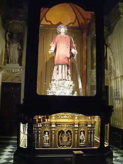 Jej autorem jest nieznany artysta ze kręgu sztuki hiszpańskiej. Przywieziona została do kościoła San Lorenzo-a-mare, do kolegiaty trafiła w 1798 dzięki donacji ostatniego inkwizytora na Malcie. Statua ubrana jest w oryginalne szaty diakona. Jej plinta, wykonana ze srebra, oraz orzechowa podstawa, pochodzą z początku XX wieku[29]. W miejscu, gdzie dziś stoi statua, znajdował się ołtarz św. Franciszka z Asyżu, który został rozebrany w 1970[5][30].