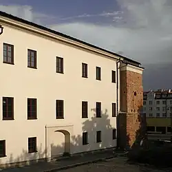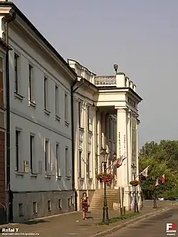 Skrzydło frontowe usytuowane od strony Rynku zbudowane zostało na planie wydłużonego prostokąta, jest podpiwniczone i posiada siedemnastoosiową fasadę, z płytkim, siedmioosiowym ryzalitem, ozdobionym czterokolumnowym portykiem toskańskim w wielkim porządku oraz pilastrami w stylu toskańskim. Portyk nakryty jest attyką balustradową. Poszczególne kondygnacje rozdziela gzyms kordonowy, gzyms koronujący jest profilowany. Pierwotny układ wnętrz zachował się szczególnie w zachodniej części budynku, która jest też najbliższa pierwotnemu projektowi Solariego. Na uwagę zasługują tu szczególnie korytarz zachodni, sklepienia piwnic i pomieszczeń parteru oraz belkowane stropy w niektórych pomieszczeniach piętra. Od strony ulicy Wałowej w budynki założenia popijarskiego wkomponowane są relikty średniowiecznych murów obronnych z bramą krakowską (iłżecką)[2].