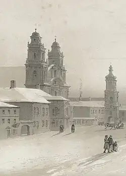 Wieża-dzwonnica, wzniesiona w stylu późnego baroku w 1750 roku przed rezydencją jezuitów, po prawej stronie od kościoła, dopełniła kompozycję zespołu kolegium. Zbudowana została na planie kwadratu, posiadała trzy kondygnacje i zwieńczenie w formie barokowej kopuły[7]. Na górnej kondygnacji został zawieszony zegar[16]. Była bardziej estetyczna, wdzięczna i harmonijna od wież kościelnych[17]. W XIX wieku z wieży zdjęto kopułę[8]. Na początku XX wieku została nadbudowana – dodano jej dwie kondygnacje, jednocześnie zachowano jej styl architektoniczny, przywrócono także kopułę[17].