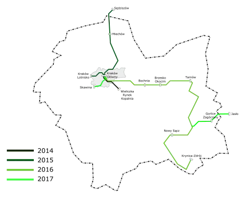 - ↑ Koleje Małopolskie świętują 10-milionowego pasażera. rynek-kolejowy.pl, 2017-08-10. [dostęp 2017-10-06]. (pol.).
