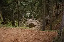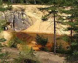 Obok wyrobisk znajdują się duże hałdy zmielonych skał.