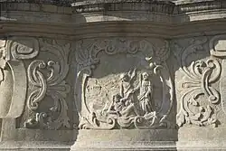 Autorem dzieła, wykonanego w 1731 r. jest miejscowy rzeźbiarz i kamieniarz, I. Melczer. Plan podstawy w postaci dwóch niskich stopni jest trójosiowy. Na podstawie umieszczony jest takiż cokół, nakryty płaską płytą. Na trzech ścianach cokołu, dekorowanego motywami roślinnymi i ludzkimi twarzami, znajdują się płaskorzeźby przedstawiające patronów, chroniących od zarazy: św. Rozalię, św. Sebastiana i św. Rocha. Na trzech zaokrąglonych narożnikach płyty wieńczącej cokół znajdują się figury św. Mikołaja, św. Karola Boromeusza i św. Katarzyny Aleksandryjskiej[2].
