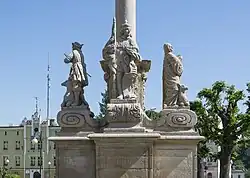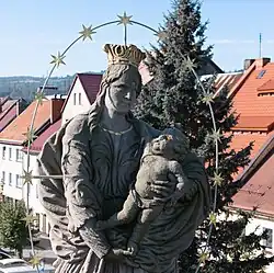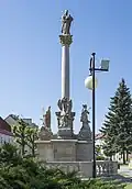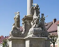 Kolumna wykonana jest z szarego piaskowca. Stoi w centrum miasta, na trójkątnym wydłużonym rynku, w środkowej jego części na niewielkim skwerze otoczonym zielenią. Konstrukcja architektoniczna ustawiona jest na dwustopniowej ośmiobocznej płycie, na obrzeżach płyty osadzona jest balustrada wykonana z piaskowca wsparta na stylizowanych prostokątnych filarkach. Na środku płyty osadzony jest cokół kolumny w kształcie krzyża greckiego, którego ramiona tworzą cztery postumenty zakończone spłaszczonymi wolutami. Na wolutach stoją figury czterech świętych: Wacława, Benedykta, Huberta, Michała Archanioła[2]. Na środku cokołu ustawiona jest czworoboczna stylizowana baza, na której osadzona jest okrągła wysoka kolumna. Na kolumnie, zwieńczonej toskańską głowicą stoi posąg Marii z Dzieciątkiem. Na cokole na czołowych ścianach krzyża greckiego napis z czterech stron: „ORA PRO NOBIS S. MARI”. Wykonanie kolumny przypisywane jest tzw. "warsztatowi lesickiemu"[3].