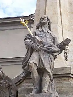 Cokół na czterech narożach zwieńczony jest rzeźbami czterech orędowników. Są to kolejno św. Karol Boromeusz – patron fundatora kolumny, św. Roch – patron chroniący od zarazy, św. Sebastian – patron od morowego powietrza, św. Józef – patron rodzin i ojców.