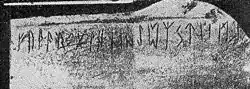 z pominiętą literą b oraz brakującymi ostatnimi trzema literami[5]. Podwojona kreseczka poprzeczna w literze h wskazuje na zachodniogermańską proweniencję napisu[4]. Jego autorstwo przypisywane jest zazwyczaj Longobardom, przebywającym w okolicach dzisiejszej Brezy między 535 a 567 rokiem[6].