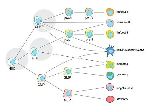 – CMP (common myeloid progenitor) – wspólne komórki progenitorowe linii mieloidalnej i granulocytarnej;