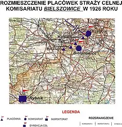 Zarządzeniem Dyrekcji Ceł „Mysłowice” z 15 czerwca 1922 roku utworzono komisariat Straży Celnej „Bielszowice” podległy Inspektoratowi Celnemu w Rybniku[5][6]. W dniu następnym do Bielszowic przybyła załoga komisariatu w sile 40 strażników. Rozlokowano się w domu gminnym przy ulicy Głównej 3[7]. Kierownicy placówek zabrali swoich podwładnych i odmaszerowali do Karol-Emanuel, Pawłowa, Kończyc i Makoszowa[5]. Ochraniany odcinek granicy państwowej zaczynał się przy kamieniu granicznym nr 159 na cmentarzu w Rudzie Śląskiej, a kończył w Mizerowie przy kamieniu nr 204. Długość odcinka wynosiła 12 730 metrów[7].