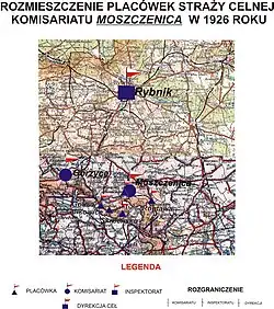 Na wniosek Ministerstwa Skarbu, uchwałą z 10 marca 1920 roku, powołano do życia Straż Celną[2]. Od połowy 1921 roku jednostki Straży Celnej rozpoczęły przejmowanie odcinków granicy od pododdziałów Batalionów Celnych[3]. Proces tworzenia Straży Celnej trwał do końca 1922 roku[4]. Komisariat Straży Celnej „Moszczenica”, wraz ze swoimi placówkami granicznymi, wszedł w podporządkowanie Inspektoratu Straży Celnej „Rybnik”[5].