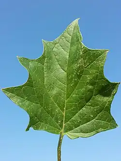 - Lśniące, dłoniasto 5-klapowe, zatokowo ząbkowane na brzegach. Są ciemnozielone i mają sercowatą nasadę.