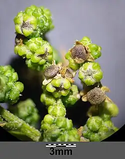 - Drobne orzeszki otoczone zmięśniałym okwiatem. Nasiona mają średnicę 1,1-2 mm i powierzchnię pokrytą dołkami o dość wyraźnych krawędziach.