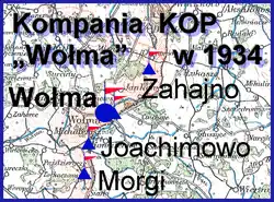 - ↑ W 2000 Rajmund Szubański napisał, że sformułowania zawarte w artykule „Bataliony, kompanie, strażnice KOP” z 1993, odnoszą się do stanu sprzed 1937[27]. Wymienił następujące strażnice: „Zagajno”, „Wólmeczka”, „Joachimowo”, „Morgi”[14].