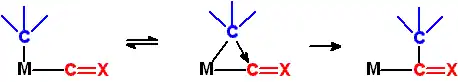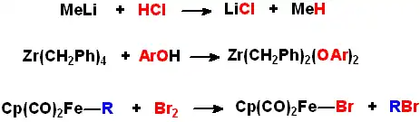 Najważniejszą z praktycznego powodu reakcją tych związków jest spontaniczny przeskok ligandu alkilowego na drugi ligand, który posiada atom węgla o własnościach elektrofilowych: