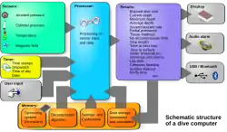 - Tryb nurkowania - w tym trybie komputer mierzy parametry nurkowania: czas, głębokość, pozostały czas bezdekompresyjny itp. Często w trybie nurkowania zawiera się dodatkowe parametry pracy komputera związane np. ze stosowanym czynnikiem oddechowym. W ten sposób komputer może pracować jako: