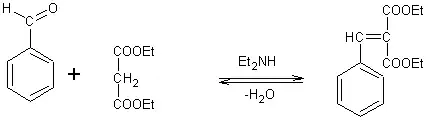 Reakcja Knoevenagela jest katalizowana przez aminy. Mechanizm tej reakcji polega na przyłączeniu anionu estru do grupy karbonylowej, po czym następuje eliminacja anionu hydroksylowego, podobnie jak w kondensacji aldolowej. Jej odmianą jest reakcja Doebnera.