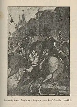 W październiku 1771 kierownik Generalności Michał Jan Pac upoważnił płk Kazimierza Pułaskiego do porwania władcy i przewiezienia go do twierdzy na Jasnej Górze. Uczestnikiem przygotowań do porwania był nuncjusz apostolski w Rzeczypospolitej Angelo Maria Durini[23]. 3 listopada 1771 na ulicy Miodowej w Warszawie król, wracający karetą został napadnięty przez oddział konfederatów. Ranny w głowę został uprowadzony poza obwałowania miasta. Tam władcy udało się wzbudzić skruchę u jednego z porywaczy, który odprowadził go do młyna na Marymoncie[24].