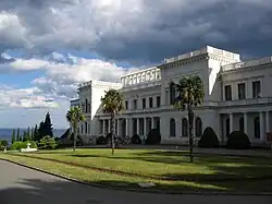 ![]() Winston Churchill, Franklin Delano Roosevelt i Józef Stalin w pałacowym patio w Liwadii | |||||||||